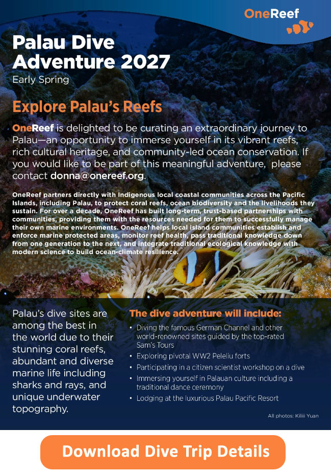 OneReef is organizing a uniquely curated experience exploring Palau’s reefs, its rich culture, and community-driven ocean conservation. If you would like to be part of this amazing journey, please send an email to donna@onereef.org with the subject “Dive Adventure 2027” and she will send you the dates for the trip by the end of March 2026 so you can plan accordingly.